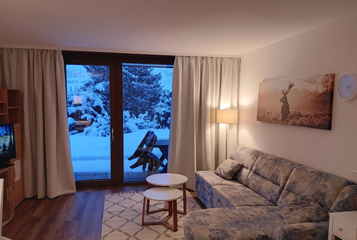 Die Wohnung verfügt über....1 Wohn/Schlafraum mit einem Doppelbett und einer Schlafcouch, Essecke und TV; Terrasse südseitig; 1 komplett ausgestattete Küchenzeile mit 4 Kochplatten, Backofen, Wasserkocher, Kühlschrank mit Gefrierfach; 1 Badezimmer mit Dusche und WC; Parkplätze am Gebäude.