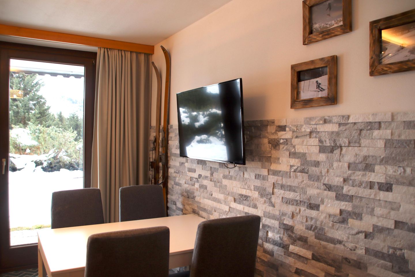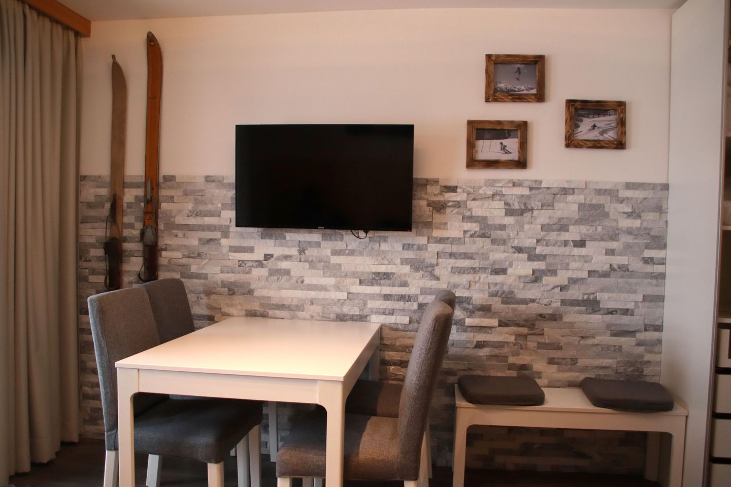 1x Doppelstockbett aus Massivholz hier haben bis zu 4 Personen platz, Essecke, gemütliche Sofaecke, TV; Terrasse südseitig; 1 komplett ausgestattete Küchenzeile mit Kaffeemaschine, Geschirrspüler, Mikrowelle, Kühlschrank und 4-Platten-Ceranfeld (KEIN Backofen); 1 Badezimmer mit Dusche und WC; Mit Fußbodenheizung in Küche und Bad. 1 Sitzbank und 2 Stühle und ein Tisch sind auf der Terrasse Sommer wie Winter zur Verfügung. Parkplätze am Gebäude.